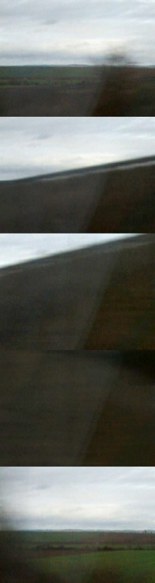 Die Filmbilder der Serien Transition und Formation zeigen Sequenzen von Tunnel- durchfahrten oder Unterführungen der Bahnstrecke Nimes-Paris-Nimes. In Transition sind die Filmbilder horizontal angeordnet. Wir können die zeitliche Abfolge nachvollziehen, indem unser Blick daran entlang gleitet. ...In der westlichen Kultur ist die räumliche Zeitvorstellung meistens eine horizontale Linie oder Pfeilspitze, die sich von links nach rechts bewegt. Wir stellen uns vor, eine Erzählung entfalte sich in dieser Richtung. Ereignisse werden empfunden, als geschehen sie in einer in einer nach Links-nach-rechts-Bewegung...Siri Hustvedt, Erinnerung in der Kunst, das Horizontale und das Vertikale Im Gegensatz dazu habe ich die Filmbilder von Formation vertikal angeordnet (sie entsprechen, der Anzahl, der in einer bzw. einer halben Sekunde aufgenommenen Bilder (10 pro Sekunde). In der vertikalen Anordnung sind Vergangenheit und Gegenwart eins und können uns in Form von Säulen erscheinen. ...Vertikale Zeit ist nicht mit selbst-bewußter Reflexion oder irgeneiner cartesiani- schen Vorstellung des Geistigen verbunden, sondern mit einer Zeit des verkörperten animalischen Seins, einer vor-personalen, vor-begrifflichen, vor-reflexiven Zeit, die Menschen und Mäusen gemeinsam ist…Siri Hustvedt, siehe oben