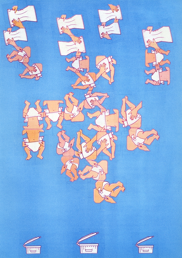 So that your baby develops freely and unhindered. / Damit sich Ihr Baby frei und unbehindert entwickelt. / Pour que votre bébé se développe librement et sans entrave. collage on paper / Collage auf Papier / collage sur papier, 29,7 x 21 cm, Karin Hoerler 1991